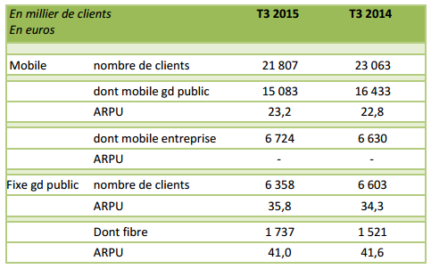 Au 3ème trimestre 2015, le groupe a augmenté à la fois l’ARPU (revenu moyen par abonné). L’ARPU mobile (abonnements et prépayés) a continué de progresser au troisième trimestre pour atteindre 23,2€, en hausse de 2,2% par rapport au deuxième trimestre 2015. L’ARPU des abonnés mobile a également augmenté pour atteindre 26,5€, en hausse de 1,7% par rapport au deuxième trimestre 2015.