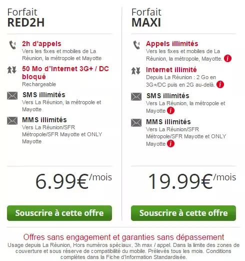 De son coté, SFR, déjà présent à La Réunion, vient de procéder à une baisse importante de ses tarifs, de l’ordre de 30%, et propose maintenant 2 forfaits qui ressemblent à ceux de Free. Le premier propose 2h de communications, avec 50Mo de data, et les SMS/MMS illimités, comme chez Free donc, mais au tarif de 6,99€. SFR Réunion propose également un forfait illimité, avec 2Go de data, à 19,99€.