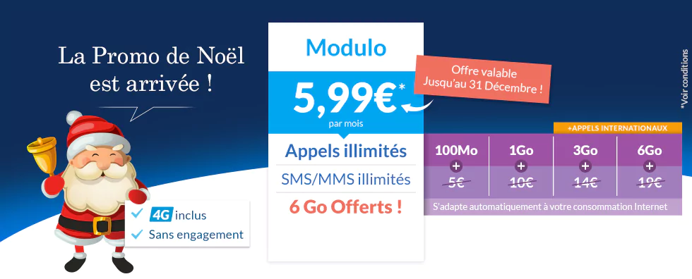 Ho Ho Ho… Prixtel lance ses promotions de Noël. L’opérateur Télécom offre 6 Go pendant trois mois pour toute nouvelle souscription. Jusqu’au 31 décembre 2015, le forfait mobile Modulo avec appels illimités en France et vers l’international, SMS/MMS illimités et 6 Go de data est proposé à 5,99€ par mois (pendant 3 mois). La carte SIM est gratuite mais les frais de livraison s’élèvent à 5€.