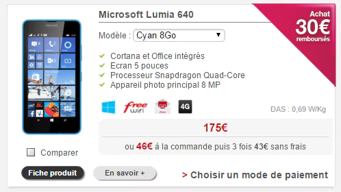Une nouvelle offre de remboursement de 30€ est disponible dans la boutique Free Mobile pour le Microsoft Lumia 640. Ce smartphone est disponible au tarif de 175€, soit 145€ avec l’ODR déduite). L’ODR est valable jusqu’au 30 novembre 2015. Pour télécharger le formulaire de remboursement, rendez-vous ici. Pour en savoir plus sur le seul Windows Phone disponible sur la boutique Free Mobile, vous pouvez découvrir un test en consultant cet article.