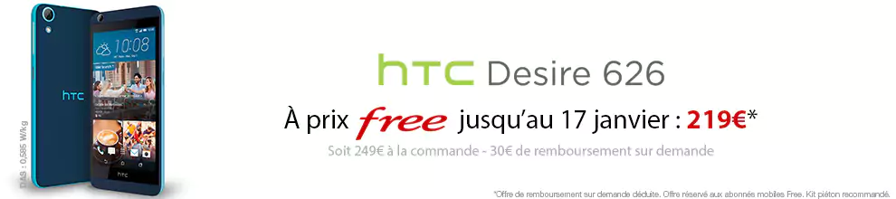 Le prix du HTC Desire 626 est en baisse sur la boutique Free Mobile. Son prix baisse de 26€, passant de 275€ à 249€ à la commande (ou en 4x sans frais : 63€ à la commande puis 62€/mois pendant 3 mois). Il bénéficie par ailleurs d’une offre de remboursement de 30€ (valable jusqu’au 17 janvier 2016), portant son prix à 219€.