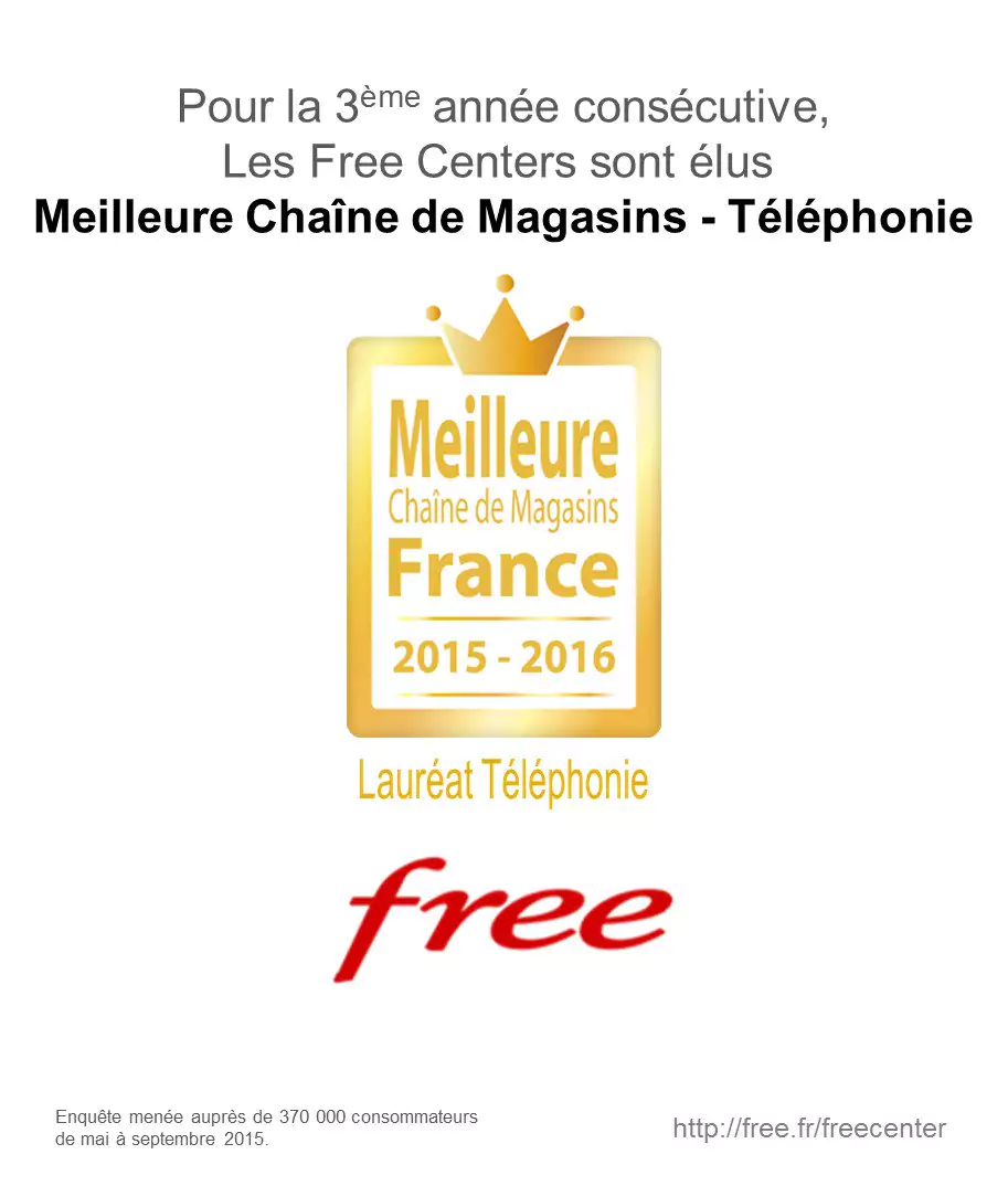 Les Free Centers viennent d’annoncer qu’ils ont été élus « Meilleure Chaîne de magasins » dans la catégorie Téléphonie. Ce prix est attribué à la chaîne de boutiques de Free pour la 3ème année consécutive. Il a été décerné après une enquête réalisée auprès de 370 000 consommateurs de mai à septembre 2015.