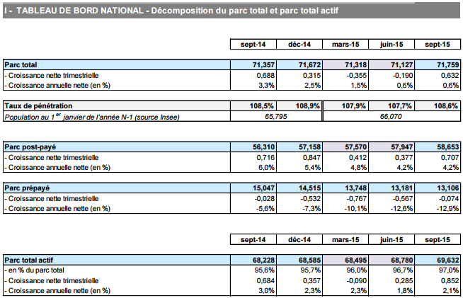 La croissance annuelle reste cependant faible (+400 000 soit +0,6% au troisième trimestre), toujours impactée par le recul du nombre de cartes SIM au premier semestre 2015. Le nombre de cartes actives (69,6 millions) s’est accru de 850 000 au cours du trimestre. Le taux d’activité des cartes SIM s’élève ainsi à 97,0%, soit +1,4 point en un an.