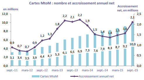 La croissance du nombre de cartes MtoM est vive au troisième trimestre 2015. Le nombre de cartes MtoM atteint le seuil des 10 millions au 30 septembre 2015 (+ 10.010 millions en métropole et 230 000 dans les départements d’Outremer). L’accroissement trimestriel est particulièrement vif au troisième trimestre 2015 avec +860 000 cartes, soit près de deux fois plus que sur les deux premiers trimestres de 2015 (environ +460 000 cartes par trimestre).