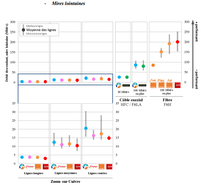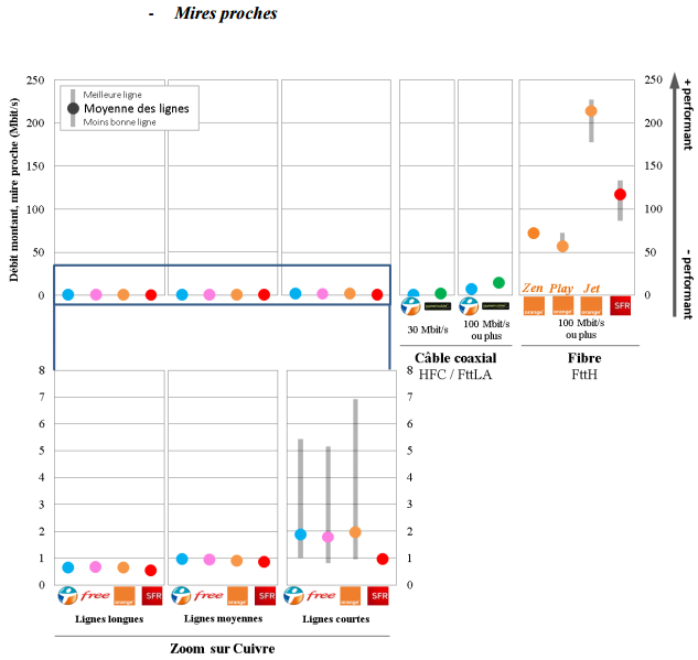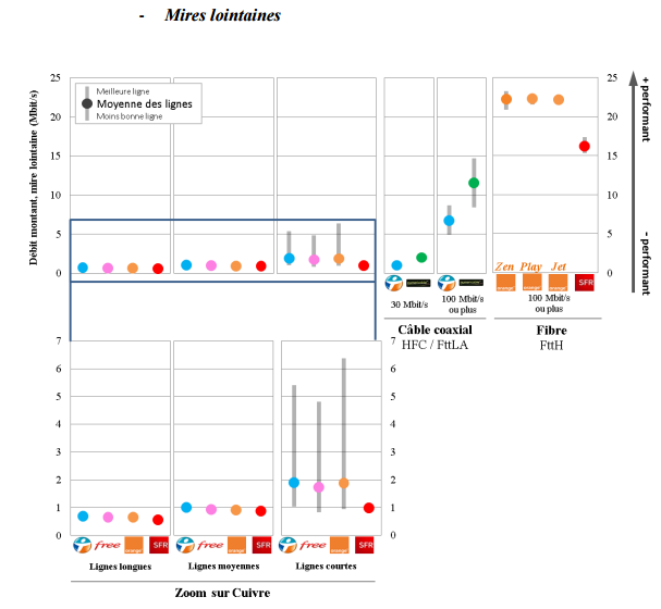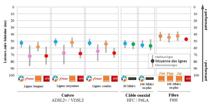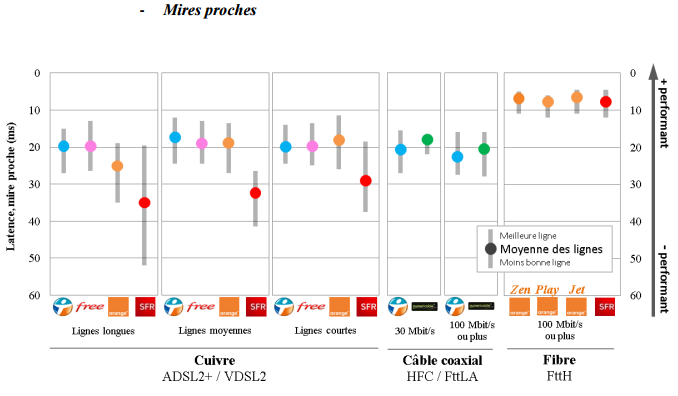 La latence dépend fortement de la distance géographique entre l’accès et la mire : sur une liaison longue distance, elle sera essentiellement due au nombre d’équipements (actifs) traversés et au temps de parcours des données dans les fibres optiques. Cela explique l’écart important entre les mires proches (situées à Lyon et Paris) et lointaines (situées à Francfort, Londres et New-York) pour cet indicateur.