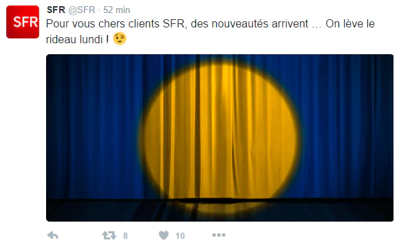SFR (Numericable) alimente le buzz sur les réseaux sociaux. Le compte officiel de l’opérateur au carré rouge annonce son Twitter : « Pour vous chers clients SFR, des nouveautés arrivent… On lève le rideau Lundi ». Cela devient presque une habitude pour les opérateurs. Ces derniers annoncent régulièrement des nouveautés à venir. Cela fonctionne en général (la preuve avec la publication de cet article) même si bien souvent, la surprise est décevante au final. C’est également cette stratégie qu’adopte SFR.