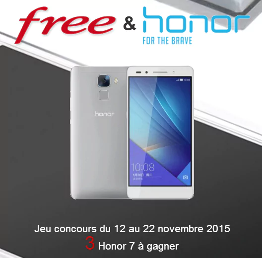 Free et Honor viennent de lancer un nouveau concours vous permettant de remporter l’un, des 3 Honor 7 mis, en jeu. Pour jouer, chaque participant devra, dans un premier temps, " liker/j’aime " la page Facebook de Free