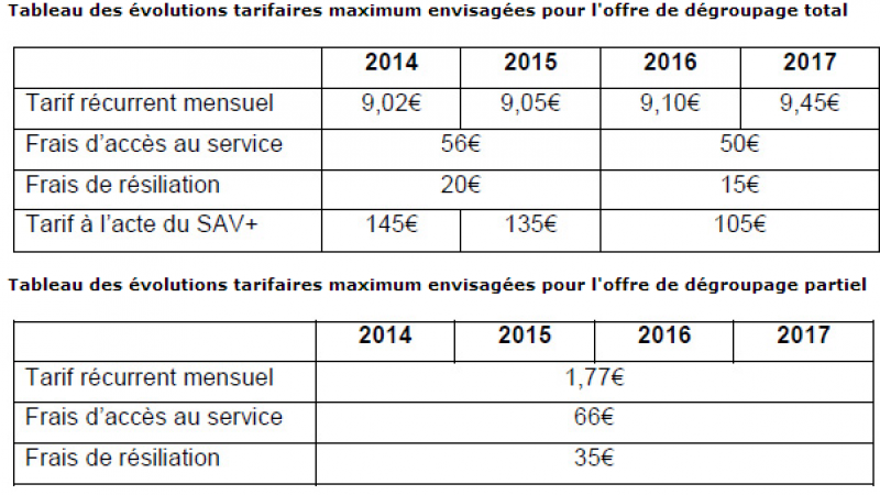 Ces encadrements, qui prennent la forme de plafonds viennent préciser l’obligation pour Orange de pratiquer des tarifs reflétant les coûts. Il s’agit surtout pour l’ARCEP d’inciter les opérateurs à déployer la fibre, en augmentant le tarif du dégroupage. Ainsi, tarif récurrent mensuel de l’offre de dégroupage total, actuellement de 9,05 € par mois et par accès, passera à 9,10 € par mois et par accès en 2016 et 9,45 € par mois et par accès en 2017.
