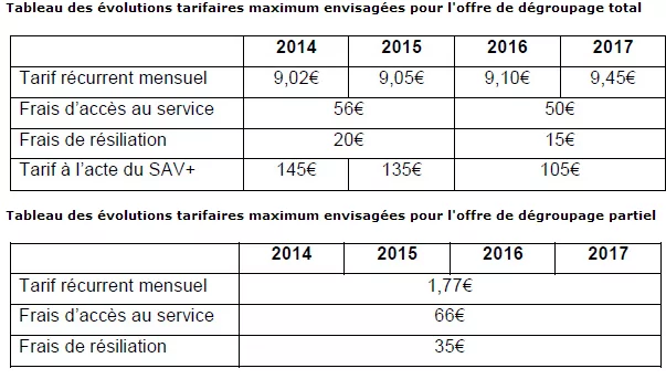 Ces encadrements, qui prennent la forme de plafonds viennent préciser l’obligation pour Orange de pratiquer des tarifs reflétant les coûts. Il s’agit surtout pour l’ARCEP d’inciter les opérateurs à déployer la fibre, en augmentant le tarif du dégroupage. Ainsi, tarif récurrent mensuel de l’offre de dégroupage total, actuellement de 9,05 € par mois et par accès, passera à 9,10 € par mois et par accès en 2016 et 9,45 € par mois et par accès en 2017.