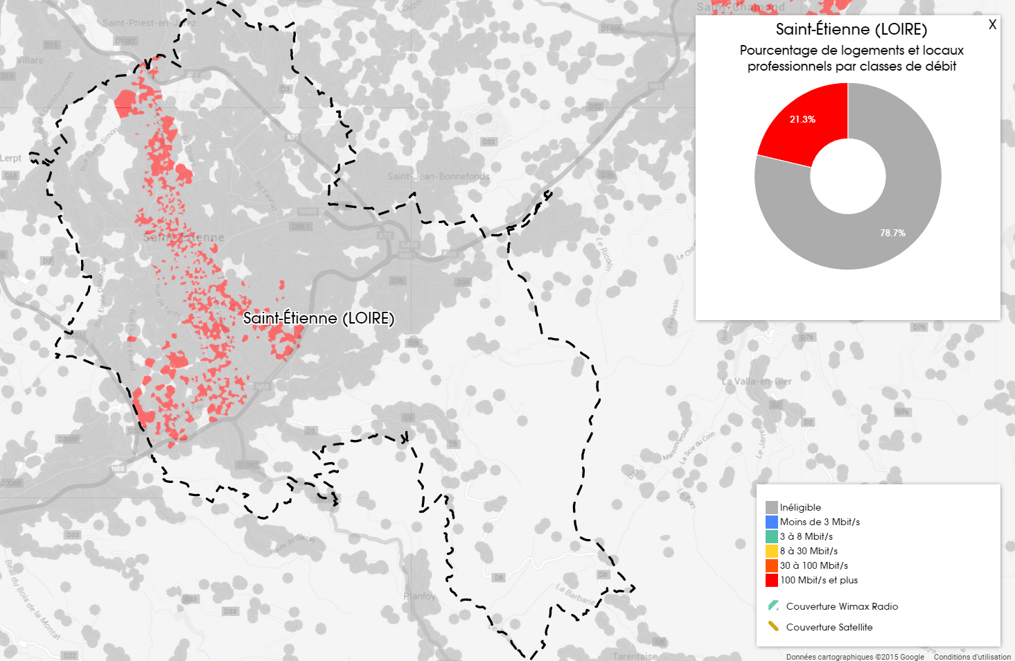 On peut voir sur la première carte que la ville de Saint-Étienne est scindé en deux avec au sud des débits faible, dépassant rarement les 8 Mbits/s et au nord une zone en majorité couvertes par le très haut-débit. 96.5% de la zone dispose donc du très haut débit et seul quelques zones au nord de la ville reste sous la barre des 30 Mbits/s.