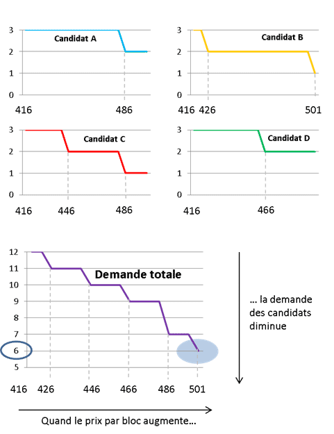 Quand la somme des demandes des candidats est égale à 6 blocs, l’enchère s’arrête et les blocs sont attribués au prix d’équilibre ainsi atteint.