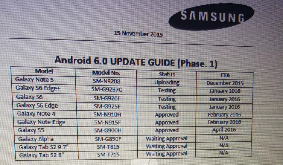 Les utilisateurs des terminaux Samsung devront encore patienter un peu pour profiter de la mise à jour Android Marshmallow. En fuite sur la toile, un document présenté comme le dernier planning du constructeur et daté du 15 novembre 2015, indique que les premiers Samsung à bénéficier du nouveau système d’exploitation mobile de Google seront les… Galaxy Note 5 (ces derniers ne sont pas disponibles en Europe), dès le mois de décembre 2015.