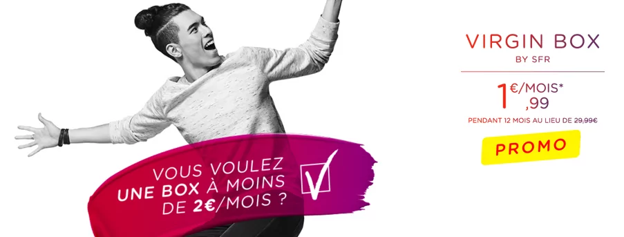 En effet, jusqu’au 22 novembre 2015, Virgin Mobile propose sa Box ADSL à 1,99€/mois pendant 12 mois. L’offre promotionnelle permet donc une remise immédiate sur facture de 28€/mois applicable pendant 12 mois sur le prix de l’abonnement Virgin Box (29.99€/mois). Les frais de résiliation s’élèvent à 59€.