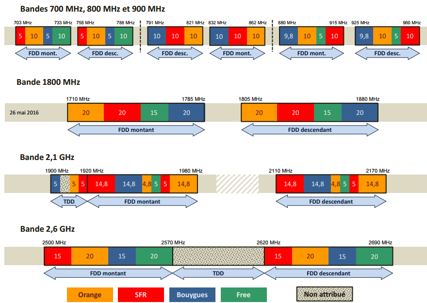 Avec les fréquences 700 MHz acquises par les différents opérateurs la semaine dernière, ceux-ci on pu compléter leur portefeuille de fréquences. L’occasion de faire le bilan des fréquences de chaque opérateur. A noter que ce n’est qu’à partir du 26 mai 2016 que Free Mobile disposera de 15 MHz dans la bande 1800 (à ce jour il ne dispose que de 5 MHz sur cette bande)