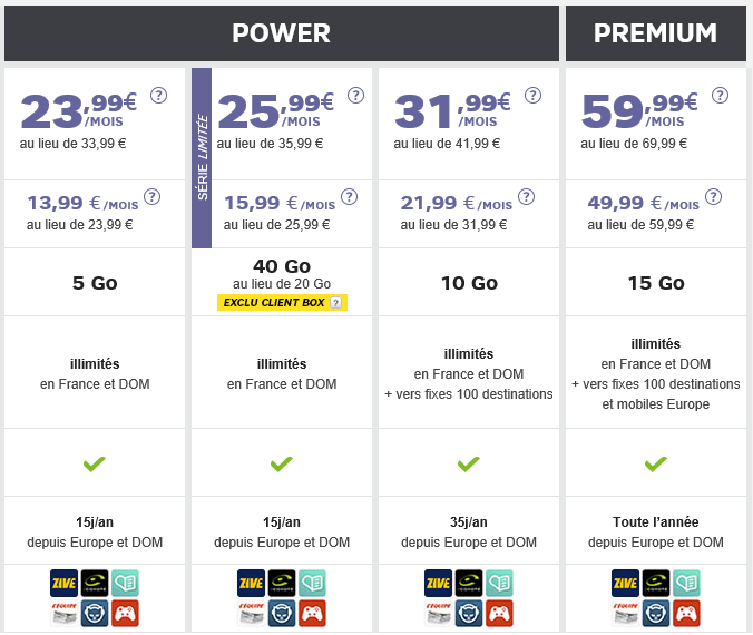NB : pour un forfait avec un mobile + engagement 24 mois, il faut ajouter 5€/mois pour les forfaits Starter, 10€/mois pour les deux premiers forfaits Power, 12€/mois pour le troisième forfait Power et 20€/mois supplémentaires pour le forfait Premium.