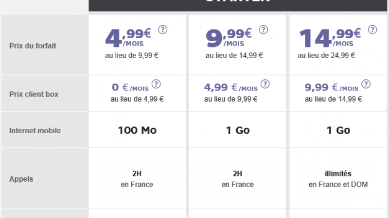 Le plus petit forfait de la gamme « Starter » commence à 4,99€/mois pendant 1 an (puis 9,99€/mois) avec un engagement de 12 mois minimum. Il inclut 2 heures d’appel, les SMS et MMS illimités et 100 Mo de data en 4G (Possibilité de blocage et data rechargeable). Le prix tombe à 0€/mois pour les abonnés box de l’opérateur, mais uniquement pendant un an. Le tarif monte à 4,99€ au delà de 12 mois.