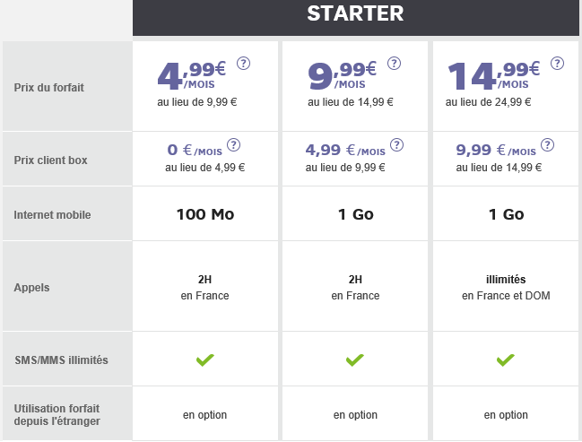 Le plus petit forfait de la gamme « Starter » commence à 4,99€/mois pendant 1 an (puis 9,99€/mois) avec un engagement de 12 mois minimum. Il inclut 2 heures d’appel, les SMS et MMS illimités et 100 Mo de data en 4G (Possibilité de blocage et data rechargeable). Le prix tombe à 0€/mois pour les abonnés box de l’opérateur, mais uniquement pendant un an. Le tarif monte à 4,99€ au delà de 12 mois.