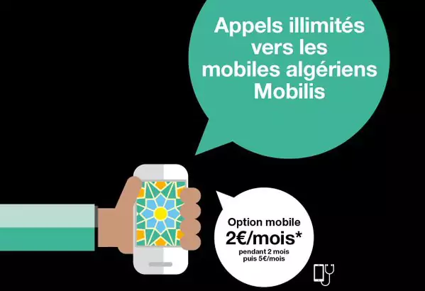Orange affiche une nouvelle option proposant les appels illimités vers les mobiles Mobilis en Algérie. Facturée 5€/mois, cette option est compatible avec tous les forfaits mobile Orange. Elle bénéficie actuellement d’une offre promotionnelle (2€/mois les 2 premiers mois puis 5€/mois).