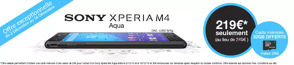 C’est bientôt Noël et les petits cadeaux prennent doucement leur place. Pour l’achat d’un Sony Xperia M4 Aqua dans la boutique Free Mobile, une carte microSD d’une capacité de 32 Go est offerte jusqu’au 16 décembre 2015. Ce smartphone bénéficie également d’une offre de remboursement de 30€. L’ODR est quant à elle valable jusqu’au 31 décembre 2015.