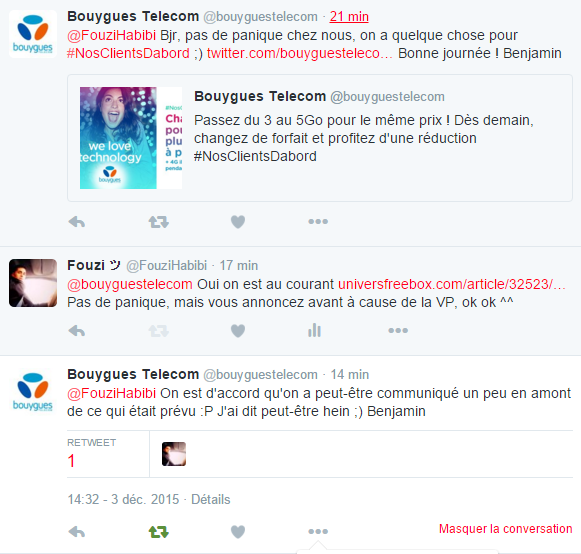 NB : Taquinés sur les réseaux sociaux, les conseillers de Bouygues Télécom nous indiquent sur Twitter que ce n’est « pas la panique chez nous, on a quelque chose pour #NosClientsDabord (…) On est d’accord qu’on a peut-être communiqué un peu en amont de ce qui était prévu 😛 J’ai dit peut-être hein 😉 ».