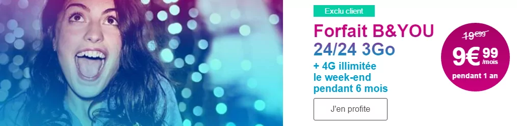 C’est désormais chose faite aujourd’hui. Contrairement à Free, SFR et Virgin Mobile, les remises de Bouygues Télécom sont réservées à ses clients (d’abord). Elles permettent par exemple de passer d’un forfait B&You (sans engagement) 3 Go à 5 Go pour le même prix (soit 19.99€/mois pendant 1 an au lieu de 29.99€/mois) ou profiter du forfait B&YOU 10 Go à 29,99€/mois pendant 1 an au lieu 39,99€/mois.