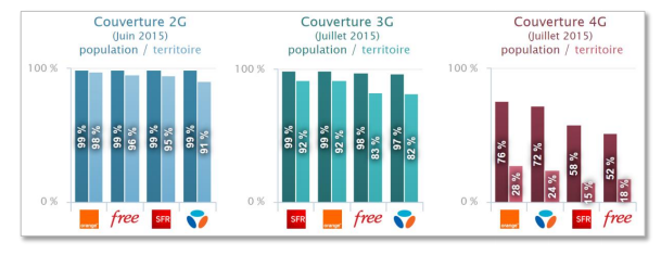 De son coté, SFR bénéfice d’un meilleure couverture 4G en utilisant le réseau de Bouygues Télécom sur les zones peu denses. Il devance ainsi Free, avec 58% de couverture de la population. Cependant, Free reste tout de même en 3ème position en ce qui concerne la couverture du territoire, avec 18% contre 15% pour SFR.