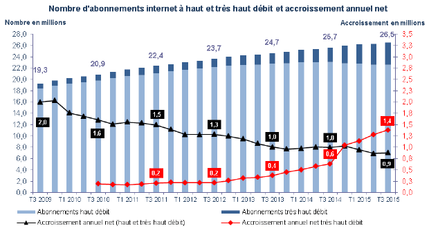 Au 30 septembre 2015, le nombre d’abonnements internet à haut et très haut débit sur réseaux fixes atteint 26,5 millions, soit une croissance nette de 270 000 abonnements au cours du trimestre. Sur un an, l’accroissement net s’élève à 890 000 (+3,4%).