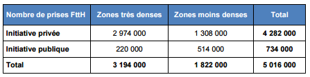 Par ailleurs, parmi ces 5 millions de logements, 1,8 million sont situés en dehors des zones très denses et 734 000 sont éligibles via des réseaux d’initiative publique. Les déploiements FttH en zones moins denses (+ 187 000) ont été plus importants qu’en zones très denses (+ 91 000).
