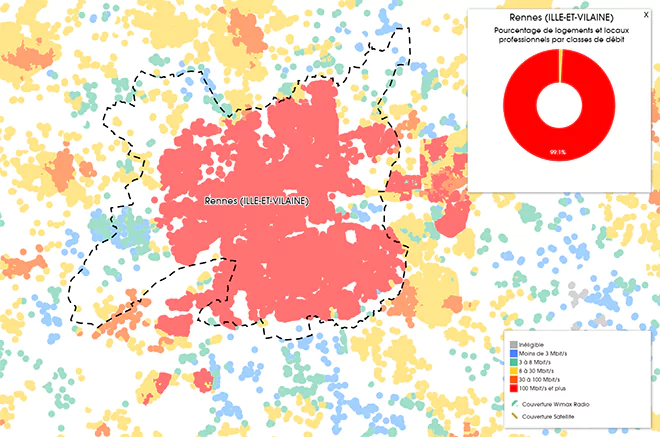 D’après la première carte, la grosse majorité de la ville de Rennes est couverte par le très haut débit, avec plus de 99% des logements et locaux pouvant avoir un débit dépassant les 100 Mbit/s. On constate quand même que les extrémités ouest et nord de la ville sont elles moins bien couvertes avec des débits variant de moins de 3 Mbit/s à 30 Mbit/s.