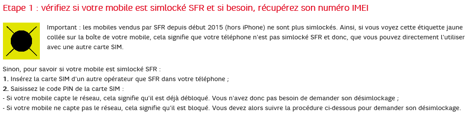 Pour différencier les mobiles desimlockés, SFR colle une étiquette jaune sur la boîte du mobile. Cela signifie concrètement que le téléphone n’est pas simlocké par SFR et donc, qu’il peut être utiliser avec une autre carte SIM (celle de Free par exemple).