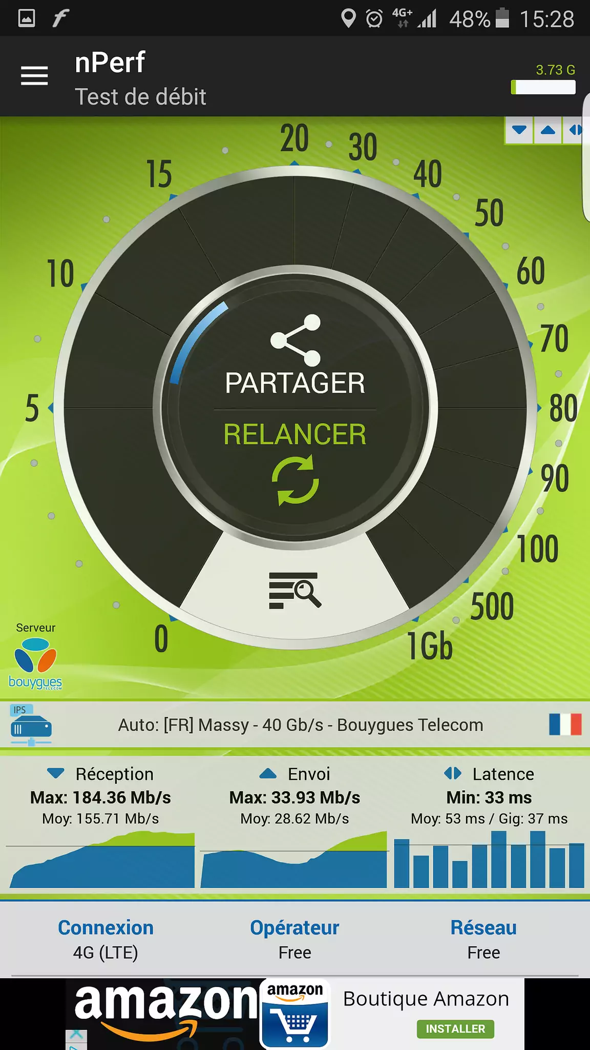 Ca souffle fort sur le réseau mobile de Free. Le précédent record en 4G+ date du 11 novembre dernier, Lotus, un abonné Free Mobile, avait alors atteint 180.4 Mb/s. Aujourd’hui, il vient une nouvelle fois de battre son record avec 184.3 Mb/s en débit descendant et 33.9 Mb/s en débit montant via l’application Nperf (installée sur son Samsung Galaxy S6 Edge+).