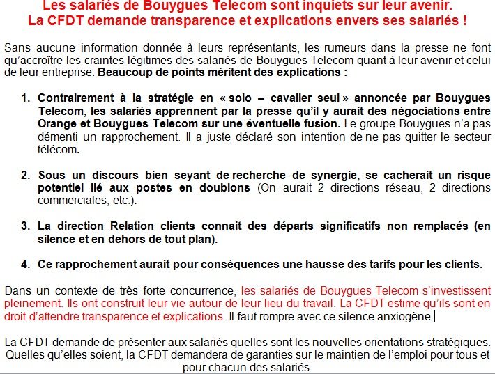 « Sans aucune information donnée à leurs représentants », et en contradiction avec la stratégie annoncée par Bouygues, « en solo, cavalier seul, les rumeurs dans la presse ne font qu’accroître les craintes légitimes des salariés de Bouygues Télécom quant à leur avenir et celui de leur entreprise ».