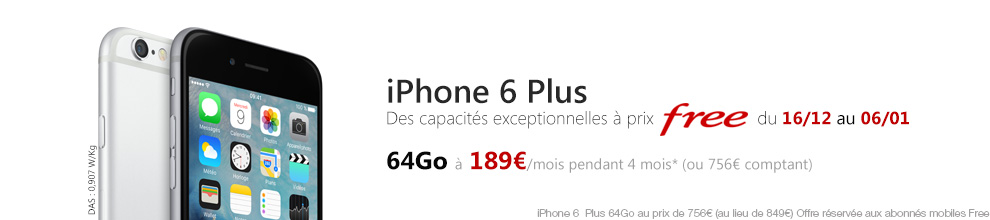 IPhone 6 Plus 64Go à 756€ au lieu 849€, soit 93€ de réduction. Cette offre est valable du 16 décembre au 6 janvier