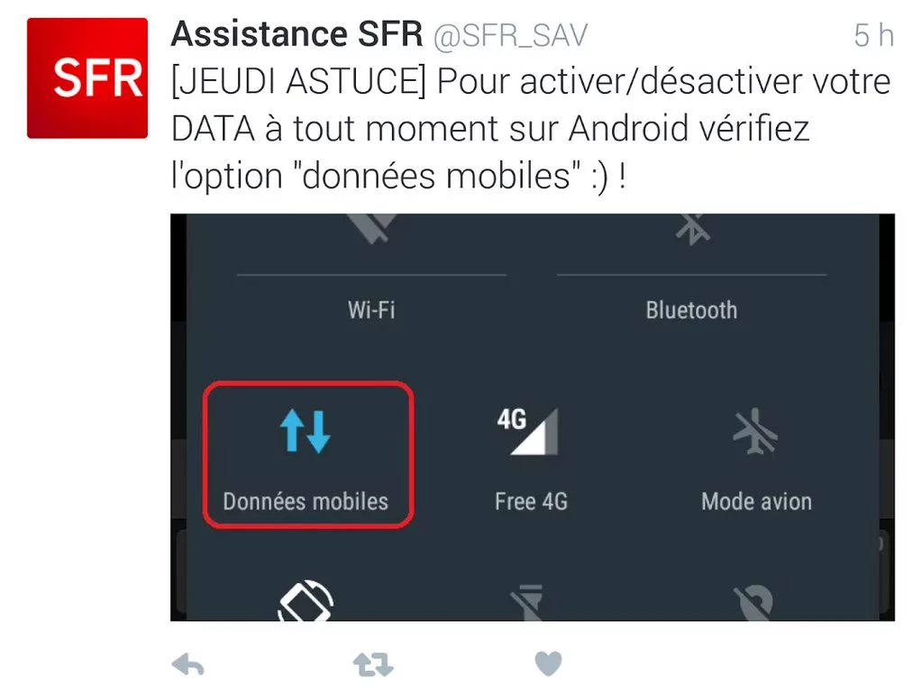 Clin d’oeil : Visiblement, SFR souhaite financer les campagnes publicitaires de ses concurrents. Après le logo d’Orange figurant sur sa boutique en ligne, SFR récidive sur les réseaux sociaux. En effet, l’opérateur au carré rouge a commis une petite bourde en souhaitant conseiller ses abonnés sur l’activation ou la désactivation de la data sous Android. Jugez par vous-même le logo et le réseau utilisé :