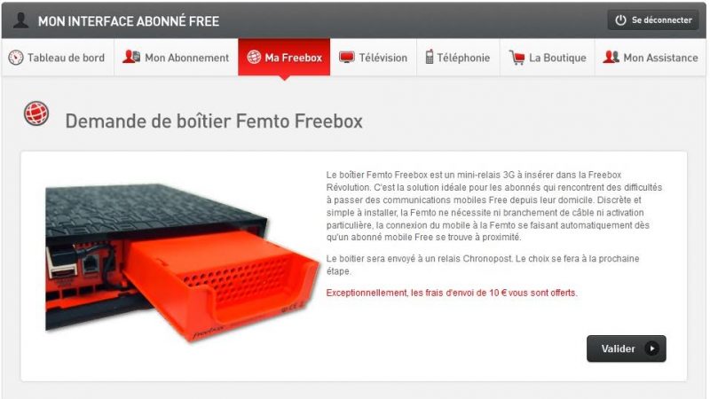 Si Free livre maintenant les Freebox Révolution (et également les Freebox Mini 4K), avec une femtocell intégrée, cela n’a pas toujours été le cas. Pour les abonnés qui n’en disposent pas, il est possible d’en commander une sur son espace abonné. La femtocell est gratuite, mais des frais de port de 10 euros sont habituellement demandés.