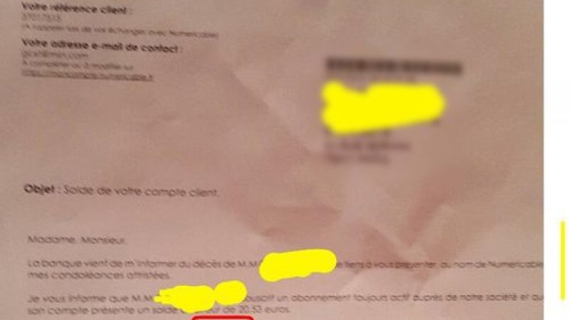 La famille d’un abonné Numéricable a reçu un courrier de la part du câblo-opérateur des plus regrettables (pour ne pas dire affligeant…). La lettre demandant au fils d’un abonné décédé de régler les arriérés de facture. Un solde débiteur d’à peine 20.53€…