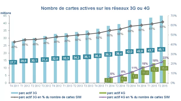 Les opérateurs adaptent donc en permanence la capacité des réseaux en fonction de l’usage de leur clientèle. L’augmentation du nombre d’utilisateurs 3G s’avère importante ces dernières années avec une croissance annuelle moyenne de près de 16 % en quatre ans. Au deuxième trimestre 2015, 63 % du nombre de cartes SIM en service l’était sur un réseau 3G pour un total de 45,1 millions d’euros.