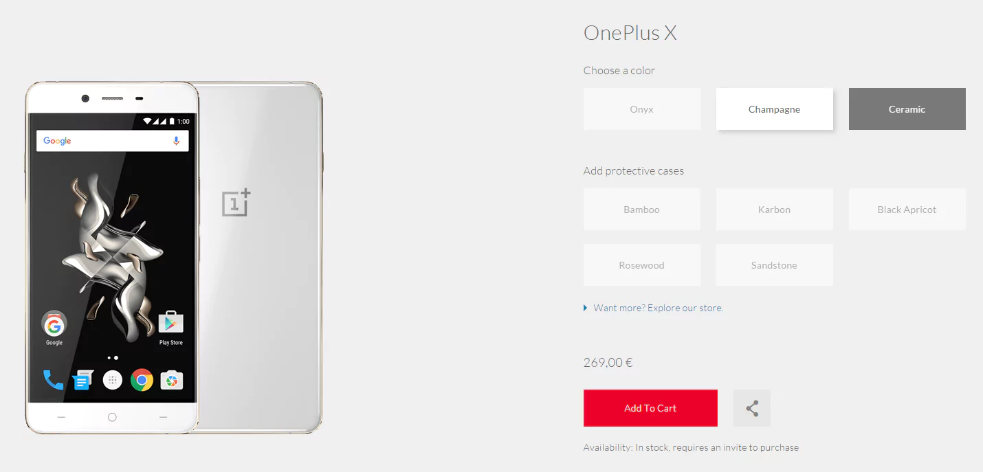 Cette nouvelle déclinaison Champagne du OnePlus X est proposé au tarif de 269 euros sur le site officiel de la marque. Néanmoins, pour l’acquérir, il faut (encore) se soumettre au système d’invitation OnePlus : « requires an invite to purchase », ou attendre mardi. Un peu dommage…