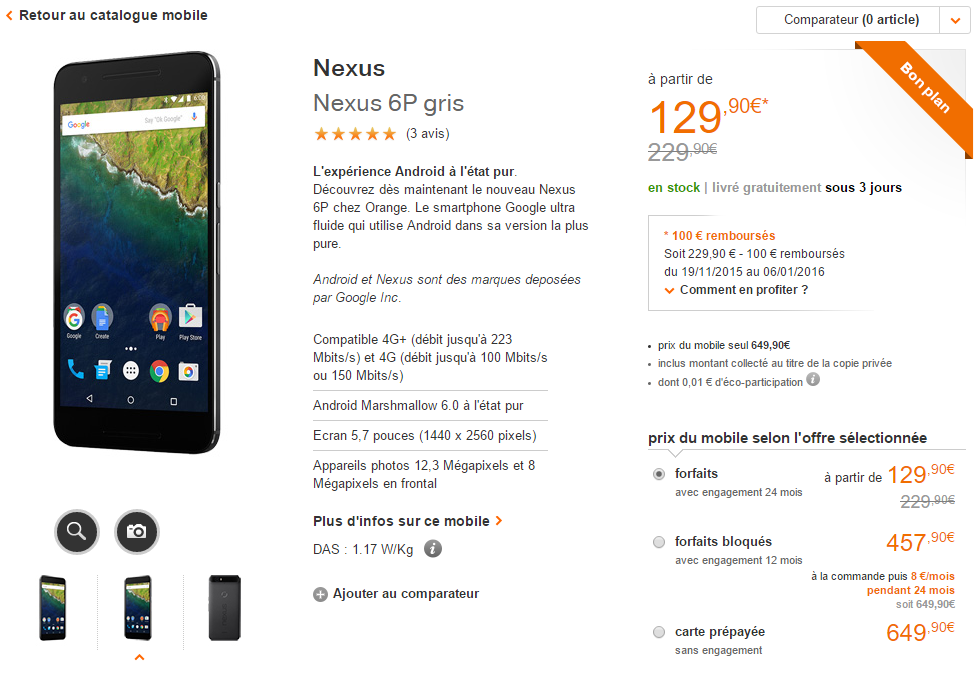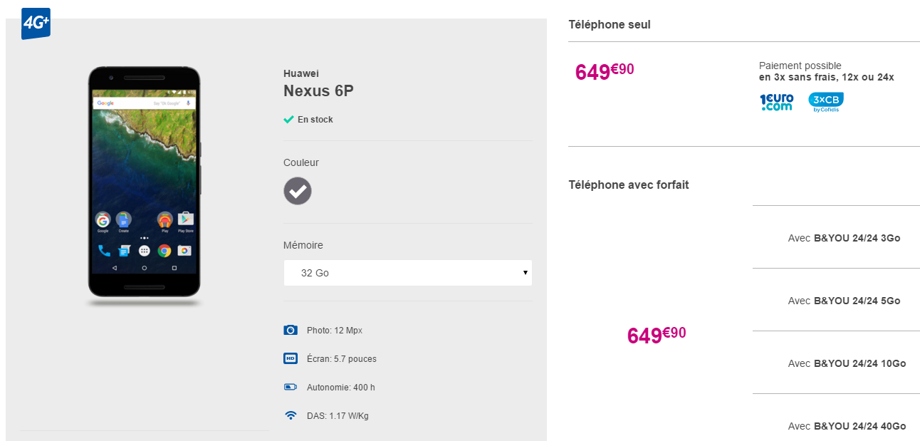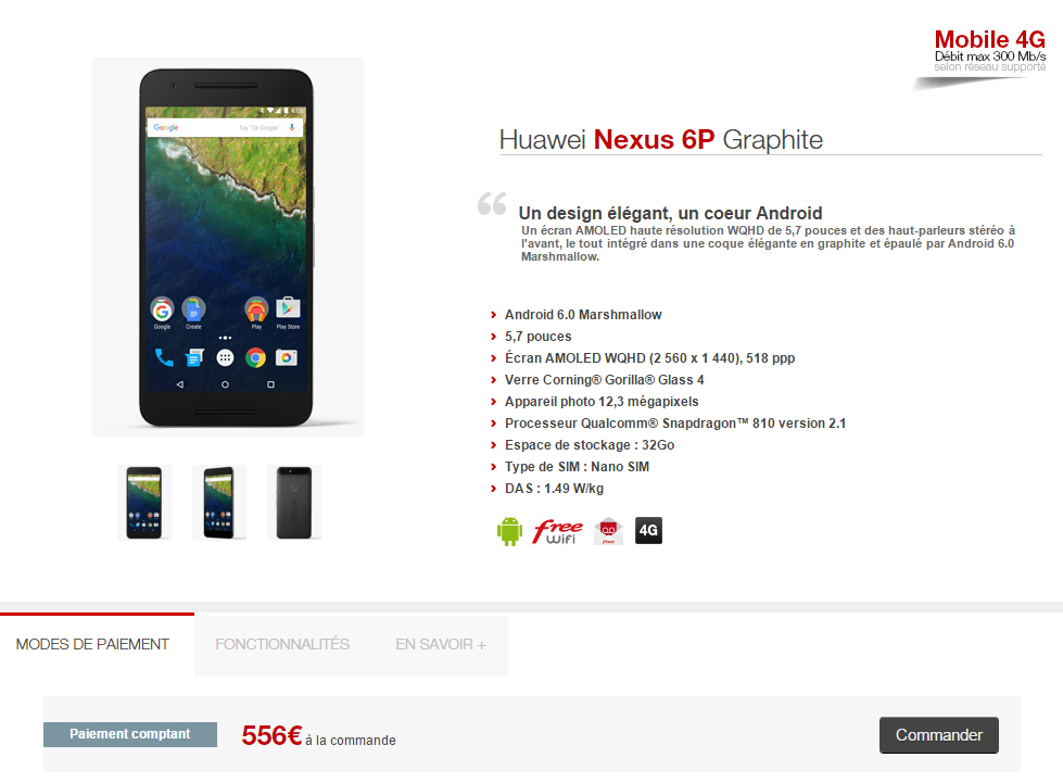Vendu en version 32 Go, le prix du Nexus 6P est actuellement plus avantageux chez Free, puisqu’il vous en coûtera 556 euros jusqu’au 6 janvier 2016. Au delà, le prix remonte à 649€ (auxquels il faut ajouter 10 euros de frais de livraison).