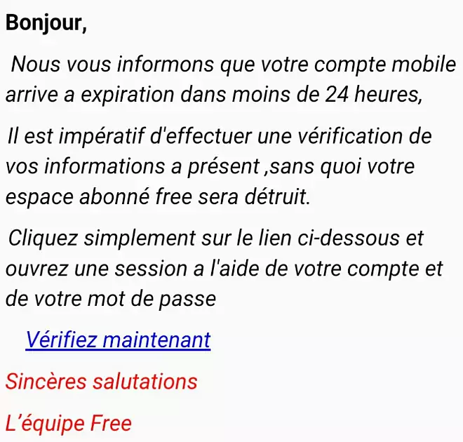 Veuillez supprimer cet pourriel si vous l’avez reçu. Pour être certain de ne pas vous faire pirater, ne cliquez jamais sur le lien présent dans le mail, mais rendez-vous directement dans votre espace abonné depuis le site de Free. Si Free Mobile avait un message à vous faire passer, l’opérateur l’affichera dans votre espace abonné.
