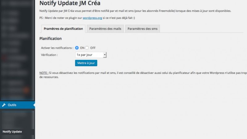 Après avoir lancé « NOTIFY Connect » en septembre dernier, "JM Créa" nous informe qu’il vient de développer "Notify Update" , un nouveau plugin WordPress compatible Free Mobile, grâce à ce système « notification par SMS ». Celui-ci permet d’être notifié par mail et/ou SMS des dernières mises à jour WordPress à effectuer (Plugins, version de WordPress et thèmes). Le plugin est paramétrable afin d’activer ou désactiver les notifications et aussi de choisir la cadence des notifications (toutes les heures, 1x par jour ou 1x par semaine). Sachant que 25% des sites Internet dans le monde utilisent WordPress, ce plugin devrait intéresser de nombreux abonnés Free Mobile.