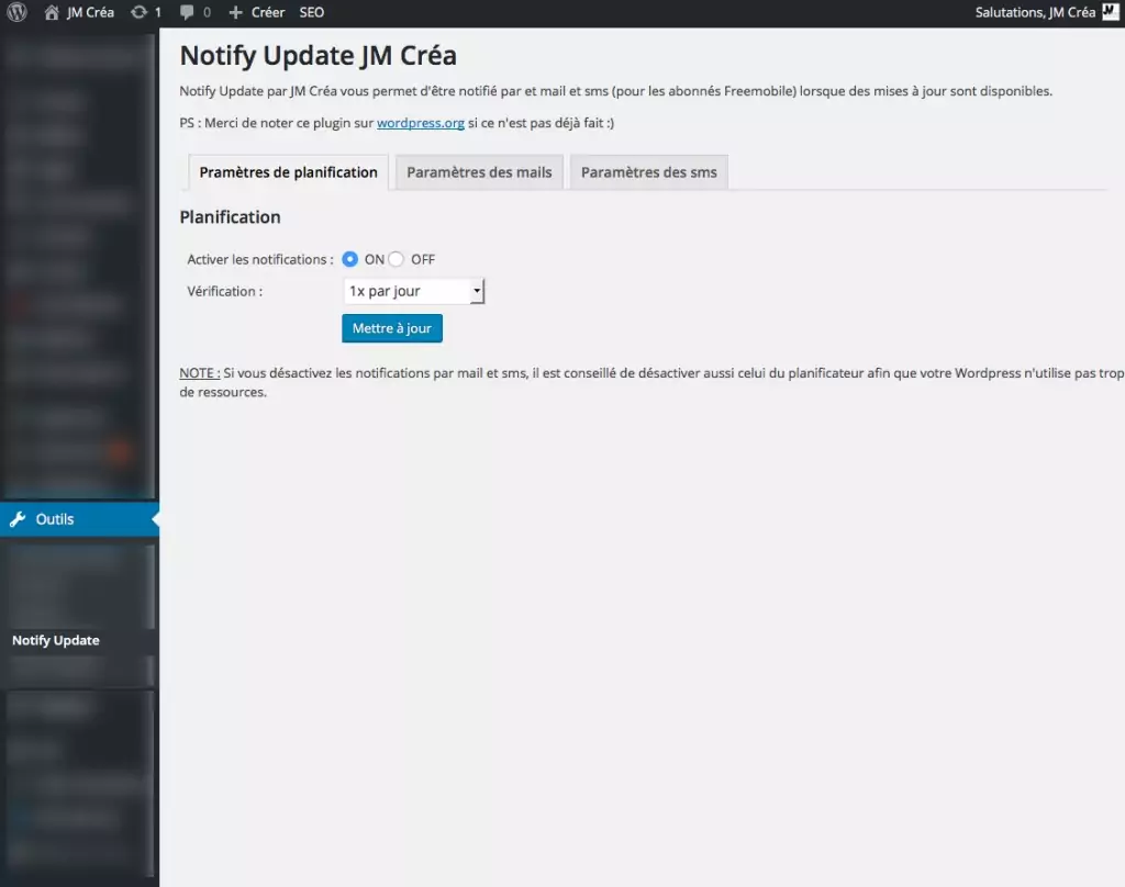 Après avoir lancé « NOTIFY Connect » en septembre dernier, "JM Créa" nous informe qu’il vient de développer "Notify Update" , un nouveau plugin WordPress compatible Free Mobile, grâce à ce système « notification par SMS ». Celui-ci permet d’être notifié par mail et/ou SMS des dernières mises à jour WordPress à effectuer (Plugins, version de WordPress et thèmes). Le plugin est paramétrable afin d’activer ou désactiver les notifications et aussi de choisir la cadence des notifications (toutes les heures, 1x par jour ou 1x par semaine). Sachant que 25% des sites Internet dans le monde utilisent WordPress, ce plugin devrait intéresser de nombreux abonnés Free Mobile.