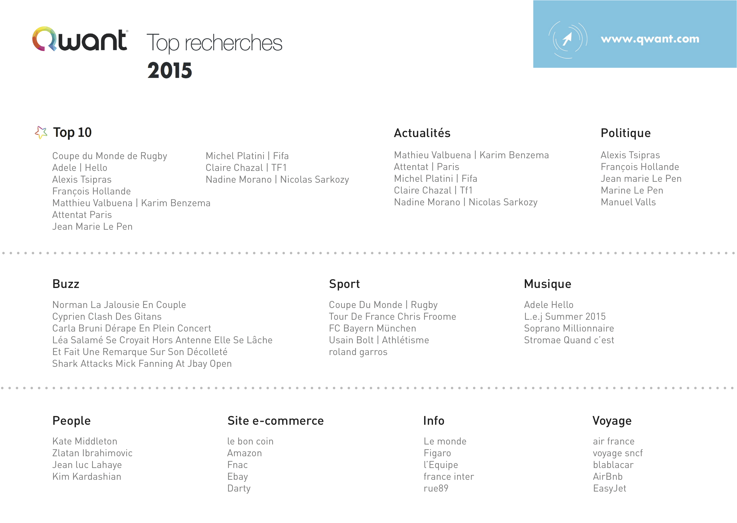 Le moteur de recherche français et européen Qwant, dévoile aujourd’hui son classement pour l’année 2015. Après une année record où il a plus que doublé son audience, avec 7,1 millions de visiteurs unique en novembre, Qwant présente le TOP 10 des recherches toutes catégories, où la Coupe du Monde de Rugby arrive en tête, mais également le classement pour différentes catégories.