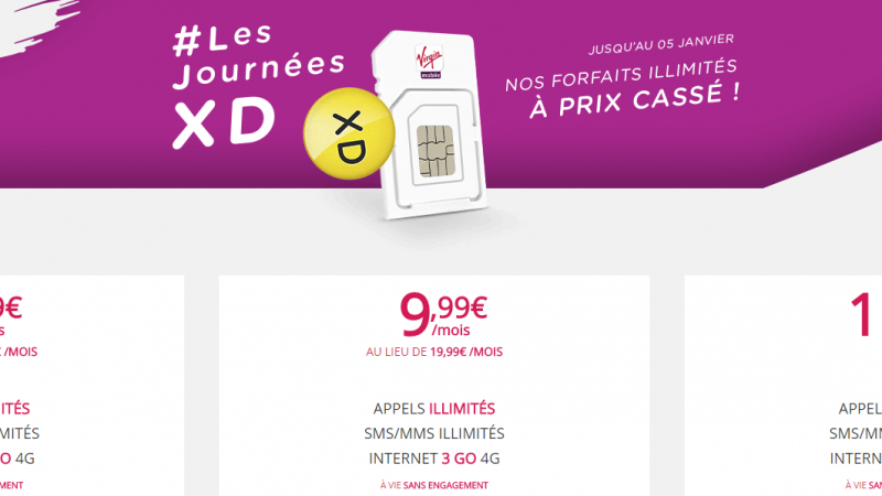 Virgin Mobile affiche une nouvelle offre promotionnelle dans le cadre de l’opération « Les Journées XD » et propose de l’illimité et 20 Go de data en 4G pour 15.99 euros par mois.