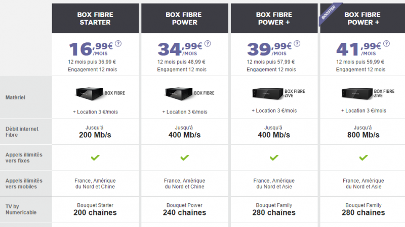L’offre suivante, « Box Fibre Power », est sensiblement la même, mais avec un accès internet jusqu’à 400 Mb/s, la télévision by Numericable (Bouquet Power 240 chaînes dont 35 en HD + VoD Zive en illimité) et les appels illimités vers fixes et mobiles de France + les fixes de 100 destinations (+ les mobiles Amérique du Nord et Chine) pour 34,99 euros mensuels pendant 12 mois (puis 48,99 euros/mois), auxquels il faut ajouter 3€/mois pour la location de la box Fibre.