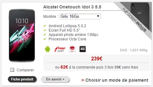 Un petit cadeau, même si Noël est passé. Un flip cover est offert pour tout achat d’un Alcatel OneTouch IDOL 3 sur la boutique mobile de Free. Sous Android Lollipop (5.0.2) et cadencé par un processeur Snapdragon 615 (Octa Core : 4×1.5Ghz + 4x1Ghz), l’IDOL 3 est un terminal puissant pour du moyen de gamme (benchmark 30 544 via AnTuTu).