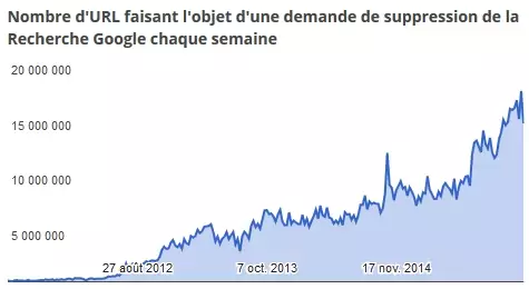 Le site ZDNet précise que les liens des services de téléchargement illégaux comme chomikuj.pl, rapidgator.net et uploaded.net abritaient beaucoup de contenus litigieux, mais d’autres sites plus connus comme reddit.com ou steamcommunity.com sont également visés. La firme de Moutain View recense, depuis 2011, ses demandes de retrait et le nombre de liens supprimés depuis. À la lecture du graphique, on constate que ces demandes ne font qu’augmenter de manière soutenue depuis cinq ans.