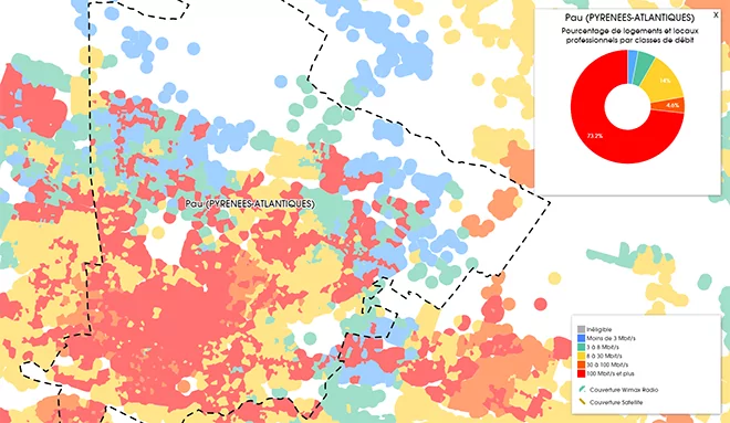 On voit sur la carte regroupant les technologies DSL, Câble et Fibre FTTH que plus des trois-quarts de la ville de Pau est couverte par le très haut débit, avec 73,2% des logements et locaux professionnels dépassant la barre des 100 Mbits/s.