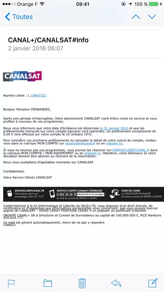 Un abonné Canalsat a reçu un courrier un peu spécial en ce début d’année 2016. La lettre du groupe Canalsat précise que l’abonnement de David Fernandez vient d’être remis en service et, qu’à ce titre, un prélèvement de 0,00 € sera effectué sur son compte à la date du 10 octobre 1972, comme le prouve la capture d’écran ci dessous.