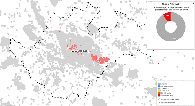 Sur la seconde carte on voit que la totalité des bâtiments dépassant cette limite de 100 Mbits/s, le sont grâce à la fibre FTTH et que la technologie du câble n’est pas présente sur la ville de Béziers.